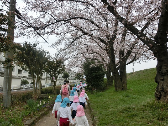 4月1日には、3歳児〜5歳児クラスの子どもたちが、浅川の土手でお花見の散歩をしました。「きれいだね」「こんなきれいなお花、おかあさんに見せてあげたかったな」と、この季節ならではの華やかな土手の道をお散歩した子どもたちは大喜びの様子でした。