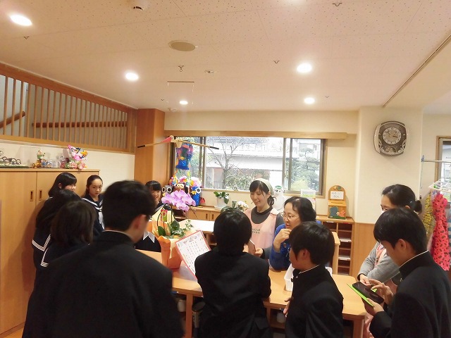 入学式が終わった午後3時過ぎ、保育園のチャイムが鳴り、つくしんぼ保育園にたくさんのお客さんが…。中学校の入学式を終えたつくしんぼ保育園の卒園児たちでした!